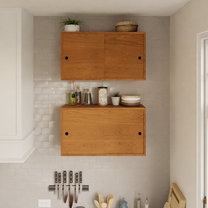 チェリー材 キッチンキャビネット引き戸付き リビング 寝室 コンパクト お洒落な収納 取付簡単